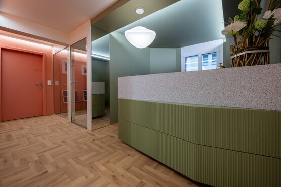 Das Farbkonzept lebt von bewusst gesetzten Kontrasten, die die eher kleinen Räume optisch weiten. Akzentwände in "Ocre Rouge“ bringen Wärme und Energie, während helle Flächen in "Porzellan Weiss“ für Leichtigkeit und Offenheit sorgen. Möbelfronten in tiefem Agavengrün verstärken die ruhige, seriöse Wirkung der Praxis. Ergänzt durch ein speziell entwickeltes Eichenvinyl-Design entsteht ein wohnlicher Charakter, der die funktionalen Anforderungen angenehm einbettet.